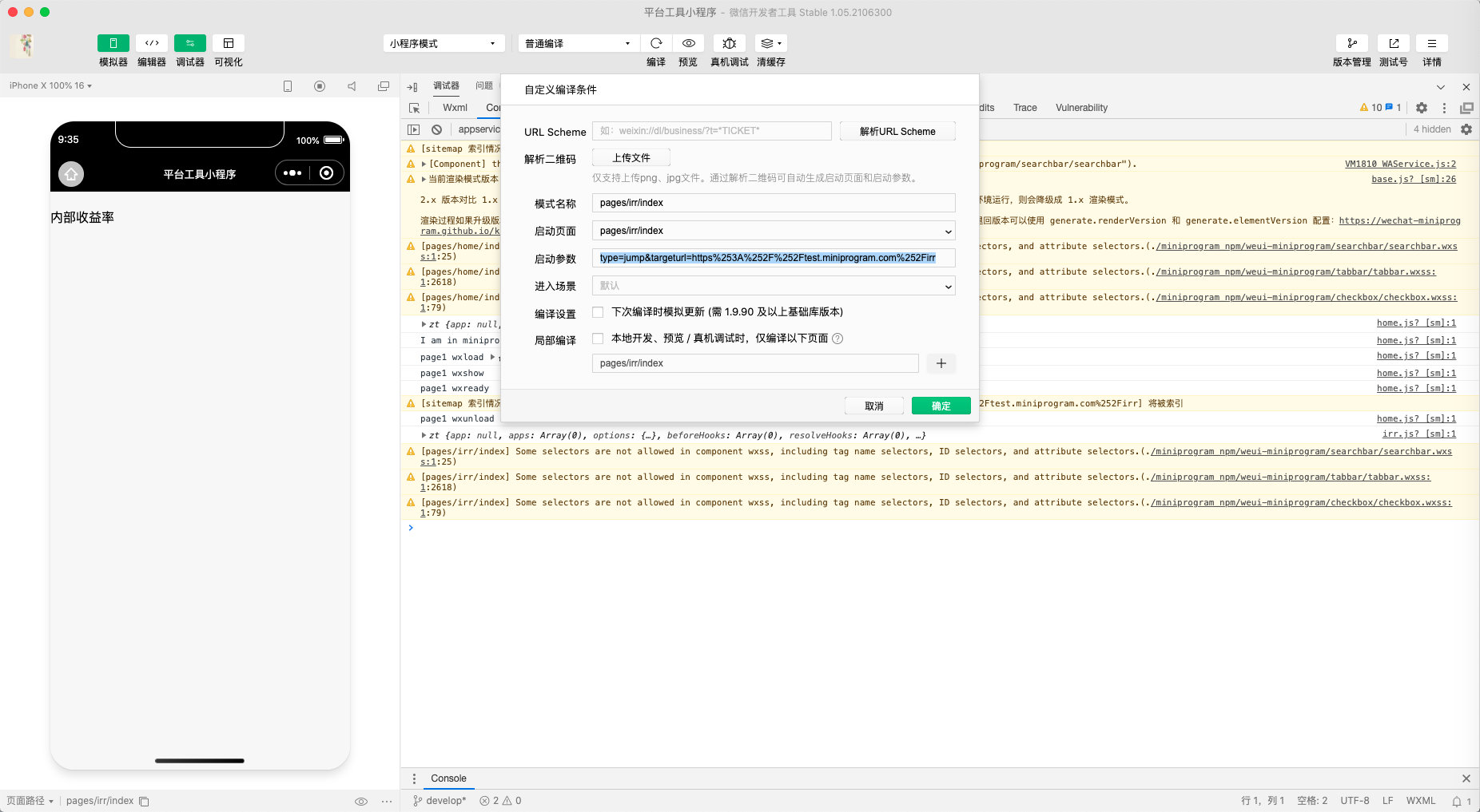 重现场景: 在主页跳转到某页面,点击 【添加编译模式】,【自定义编译条件】面板会自动添加如下参数。其中重要的两个参数:启动页面,是 dist/mp/pages
