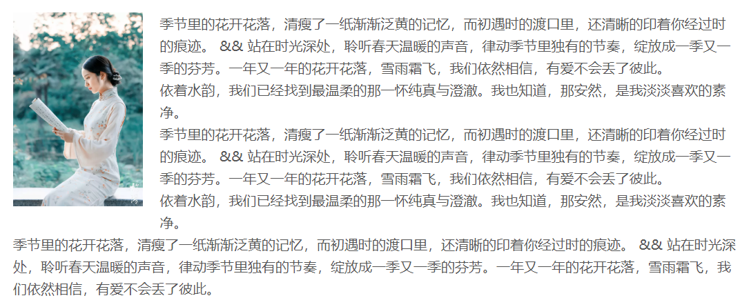 如果相邻元素是普通流的内联元素,则会影响内联元素的布局和其包含的内联元素的排列(如上图的文本模块——内联元素的位置是紧跟浮动元素,而不是从父元素的最左侧开始,且文本会尽可能围绕浮动元素)。