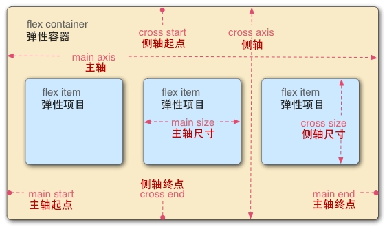 尺寸:根据弹性容器的主轴与侧轴,弹性项目的宽和高中,对应主轴的称为主轴尺寸(main size) ,对应侧轴的称为 侧轴尺寸(cross size)。