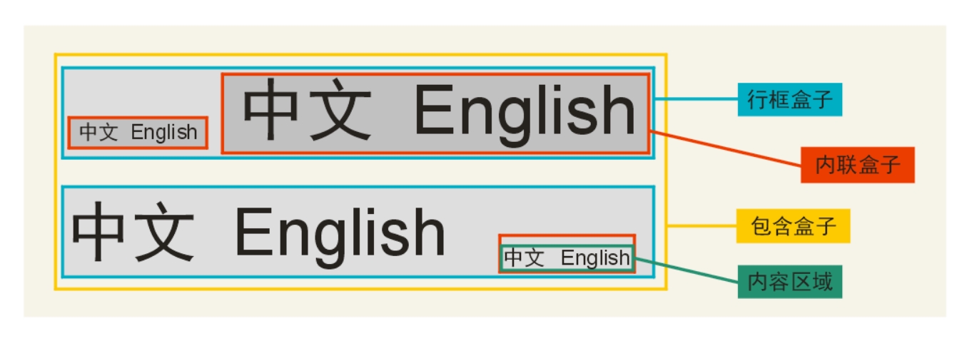 包含盒子(containing box):由一行一行的行框盒子组成,高度就是单行文本高度的累加。