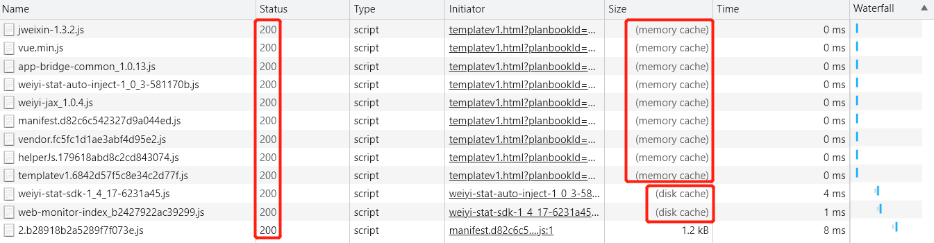 当浏览器对某个资源的请求命中了强缓存时,返回的 HTTP 状态为 200,在 chrome 的开发者工具的 network 里面 size 会显示为 (memory cache) 或者 (disk cache)。