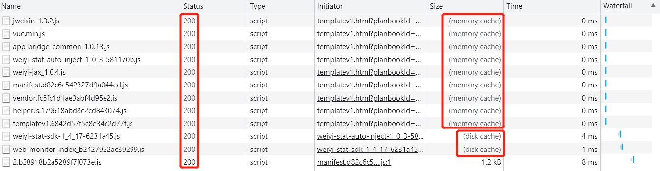 ,在 chrome 的开发者工具的 network 里面 size 会显示为 (memory cache)