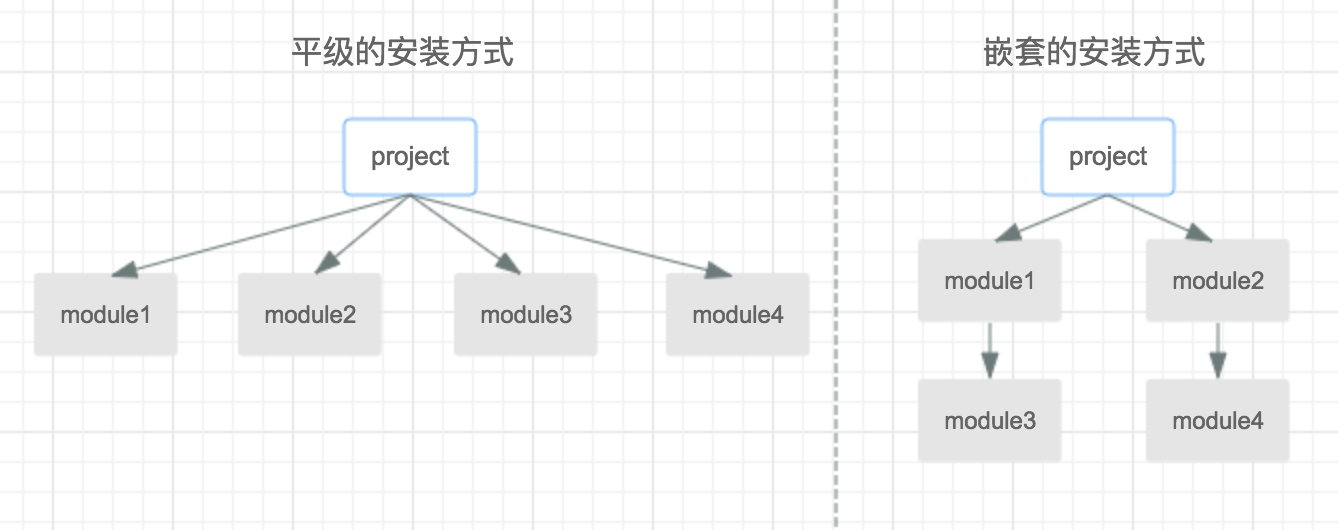 安装 npm 模块时,可能的方式有两种:平级式的安装或嵌套式的安装。