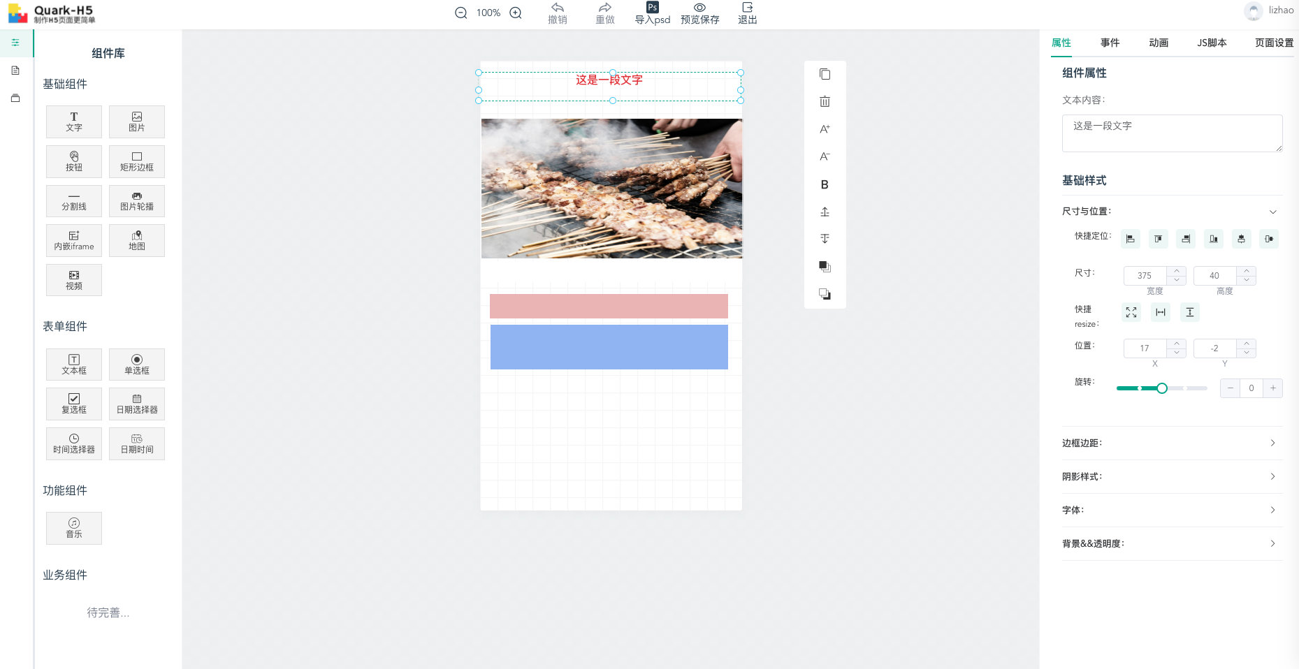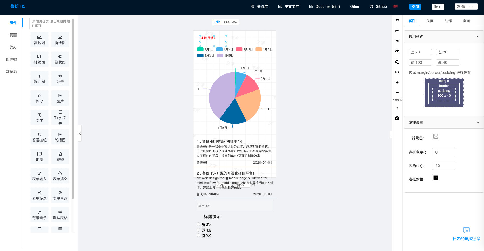 quark-h5 基于 vue2 + koa2 的 H5 可视化拖放编辑器,star高达 2.6K+。支持拖拽组件并配置属性,支持动画及效果预览,轻松快速上手制作h5页面。